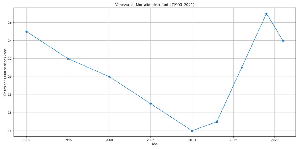 A deterioração econômica não se limitou a indicadores macroeconômicos. Em economias modernas, o colapso fiscal e produtivo costuma se refletir rapidamente na capacidade do Estado de prover serviços básicos. Na Venezuela, essa perda de capacidade institucional tornou-se visível também em indicadores sociais fundamentais, como a mortalidade infantil.